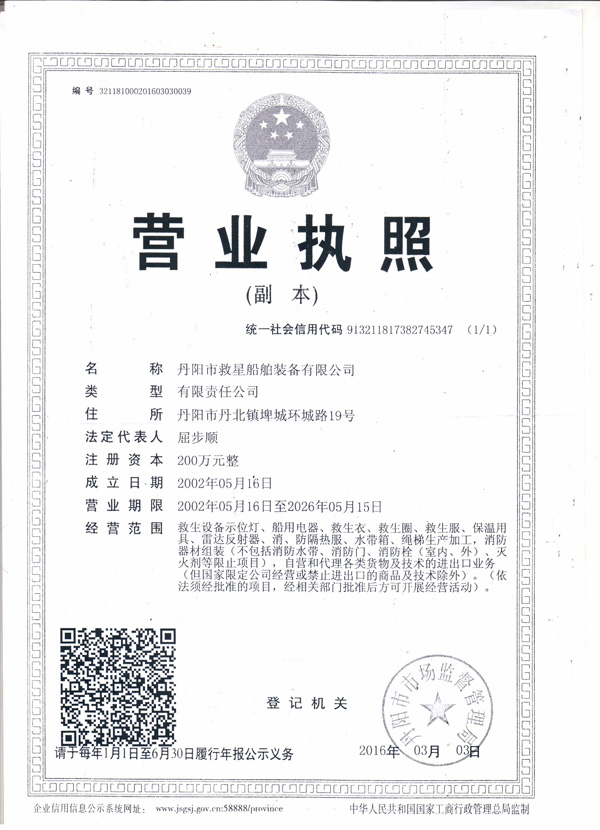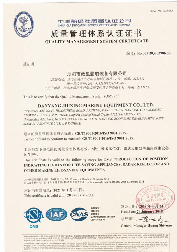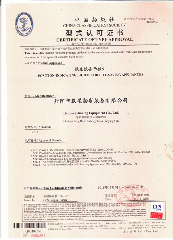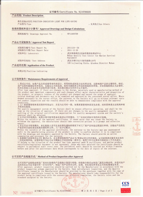 丹陽市救星船舶裝備有限公司為丹陽市船舶救生照明設(shè)備廠子公司,主要生產(chǎn)救生設(shè)備示位燈、雷達(dá)反射器、引航員軟梯、登乘梯等產(chǎn)品。其中救生設(shè)備示位燈采用國際上最先進(jìn)的科學(xué)技術(shù)、生產(chǎn)工藝,優(yōu)質(zhì)材料制造,各項技術(shù)指標(biāo)超過國際先進(jìn)水平,完全滿足國際最新標(biāo)準(zhǔn)。2012年元月取得“CCS”型式認(rèn)可證書,并具有歐共體“EC”證書。另外本公司制造的RDF400雷達(dá)反射器還獲得了實(shí)用新型專利。